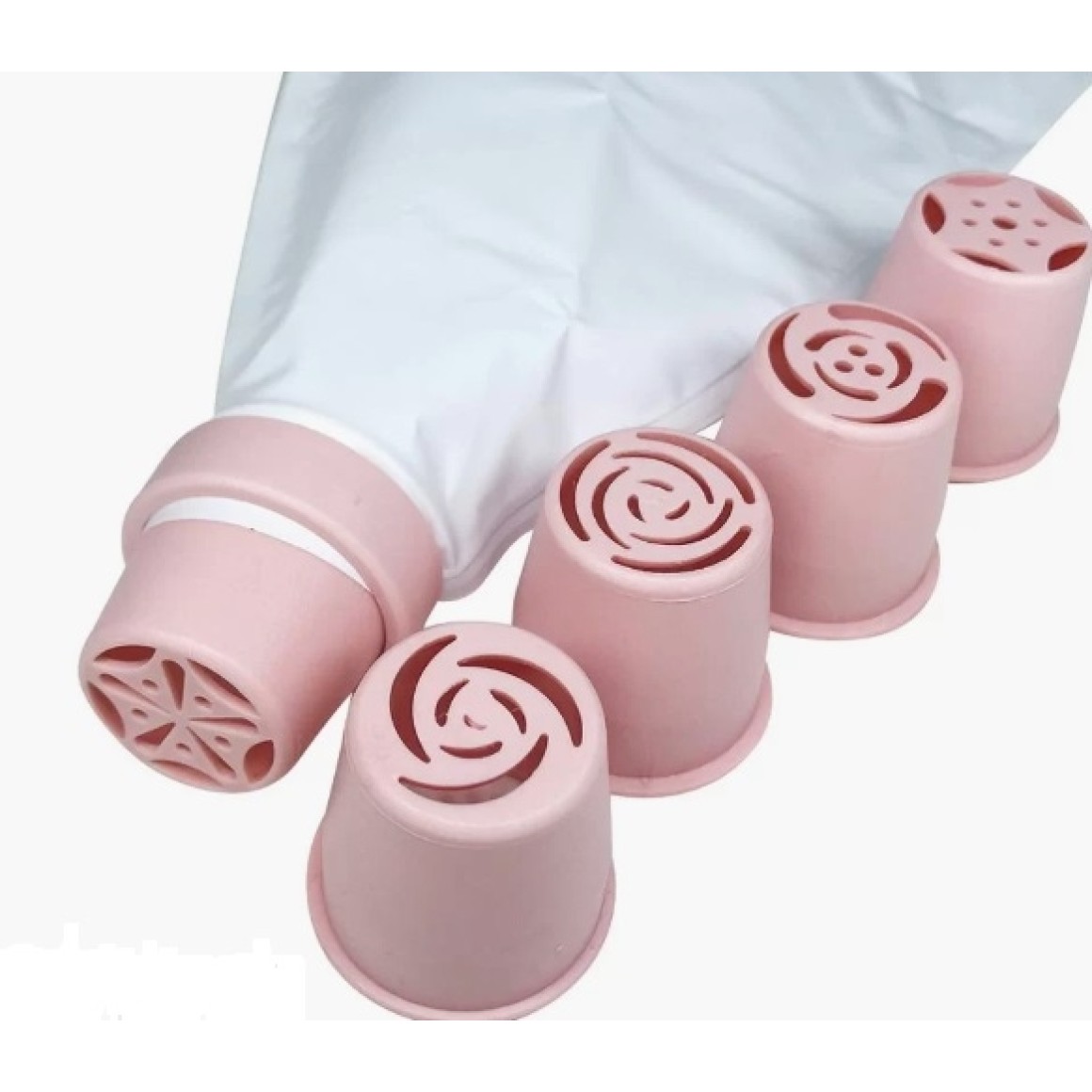 Embalagem com 1 saco (manga) de pvc, 1 anel de encaixe e 5 modelos diferente de bicos: